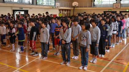 20日の朝会は、雨が降っていたので体育館で行いました。校長講話では、5・6年生の遠足でとてもよくがんばったことの報告と、国語や教科日本語とからめて「雨」のつく言葉について話しました。子どもたちもよく考えて答えてくれました。話を聞く態度も立派でした。