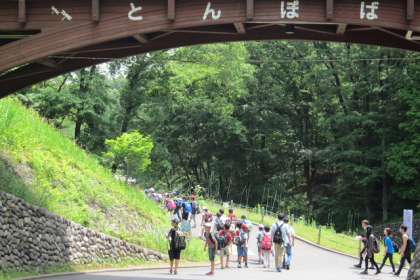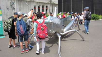 昼食後はアフリカ園から昆虫園に移動です。昆虫園の前には大きな金属製のバッタの模型があってビックリです。学年ごとに記念写真を撮りました。