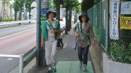 22日(水)、交通安全見回り中の保護者の方が学校の前を通りかかったので、思わず写真をパチリ。緑色のたすきをかけて、子どもたちの安全のために交代で見回っていただいています。ありがとうございます。