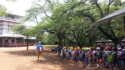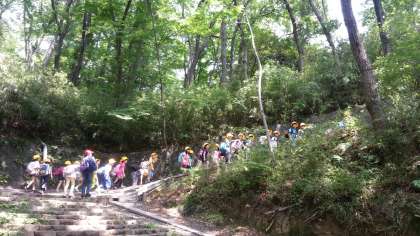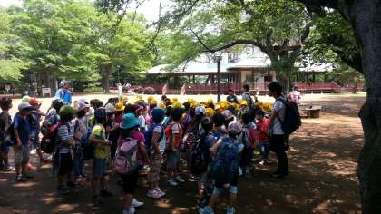 生田緑地、桝形山公園に着きました。山登りは大変でしたが、緑の木々の間を吹き抜ける気持ちよい風に励まされ、みんな登りきりました。