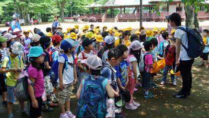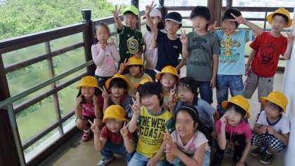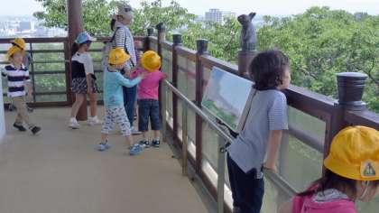公園に着いてから、希望っ子班の18グループに分かれて遊びます。今日は2年生がリーダーです。どの子もがんばって1年生のことを気づかっていました。枡形山の展望台はお城のような立派なつくりで、最上階からの眺めに子どもたちが興奮していました。