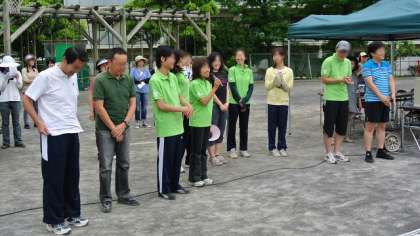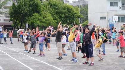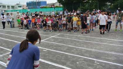 9時半開会です。今年は例年以上に参加者が多く、校庭も参加の子どもたちや家族の皆さんでいっぱいです。本校の教員も多く参加しました。最初にラジオ体操第1で準備運動です。