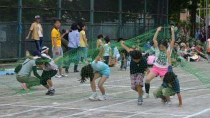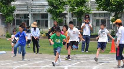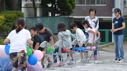 障害物競走です。スタート→なわとび走り→網くぐり→風船割り→輪投げ→ゴールです。子どもども大人も本気でがんばり、熱戦が繰り広げられました。