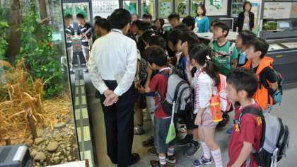 郷土資料室に入り、展示物や資料の説明を受ける子どもたちのようすです。一生懸命聞いて、自分が調べることを確認していました。