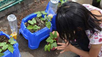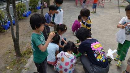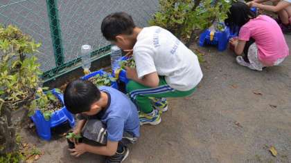 28日、1年生がアサガオの間引きをしました。写真は1組のようすです。一人一鉢育てているアサガオ。大きめに育っている3本を残して間引きします。間引いたアサガオは捨てずにポットに植え替えて家に持ち帰ったり、花壇に植え替えました。大事そうに抱えて帰る子どもたちがかわいいですね。