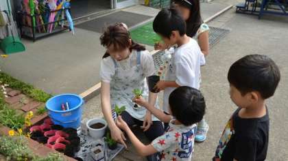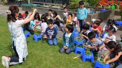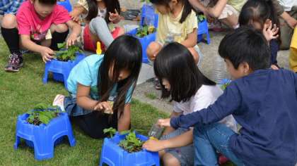 29日(水)、今日は1年2組が生活科の学習でアサガオの間引きをしました。大きく育っているものを選んで3株残します。ある子が、自分の鉢をじっと見つめて「どれをとればいかわからないよ、みんながんばってるもん」・・・とってもすてきな言葉ですね。ですから、間引くかぶは大事に大事に扱い、ぬいた株はポットに植え替えて持ち帰ります。持ち帰ることができない子は、校庭のフェンス際に植え替えました。命を大事にすることも学習しています。