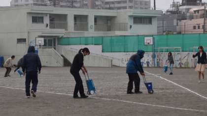 夕方5時頃、雨がふってきました。明日はスポーツテストなのに、天気は大丈夫かなと思って校庭を見ていたところ、職員が校庭に出てきて、ソフトボール投げのラインを引き始めました。今日の休み時間などでうすくなってしまったラインが、さらに雨で消えないように、上から石灰でラインを引き直していたのです。雨に濡れながらも、明日の授業に備えてがんばっている教員です。
