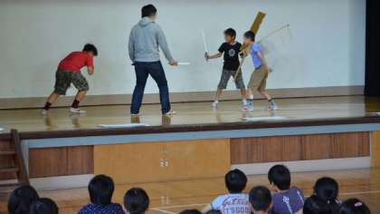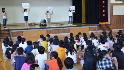 本能寺の変をあつかった寸劇には子どもたちが大盛り上がりで、クイズに答えていました。委員会の発表としてトップバッターの図書委員会。ご苦労様でした。集会が終わった後は舞台上でミニ反省会です。がんばったことを評価するとともに、次の機会に向けての課題も示しました。