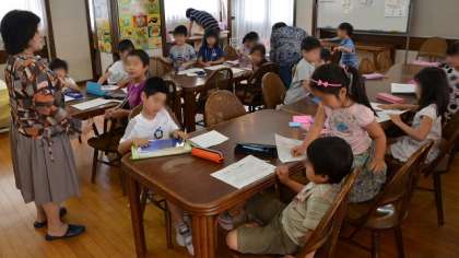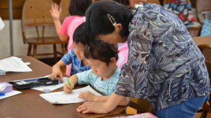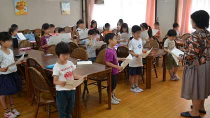 6月1日(土)、新寺子屋のようすです。ランチルームでは1年生が学習に励んでいます。講師の先生による一斉指導と、プリントなどを使った個別指導を行っています。1年生の学習習慣をつけることも課題です。参加している子どもたちは一生懸命で、国語のひらがなの書き取り練習では、講師、スタッフの方にたくさん○をつけてもらいうれしそうでした。