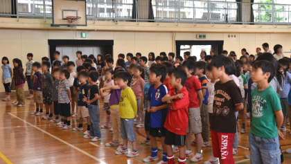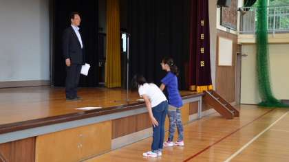 6月3日(月)、朝会を体育館で行いました。6月の最初の朝会です。いつものように6年生のあいさつ当番が出てきて、「元気に朝のあいさつをいたしましょう。おはようございます。」といいます。それに続いてみんなが元気にあいさつします。今朝の当番2人はいつもにも増して大きな声であいさつできました。校長講話では、土曜日の中学校の運動会で卒業生が活躍していた話と、昨日日曜日に「あおばまつり」でPTAや地域の方ががんばってイベントを盛り上げてくださっていたこと、そして今月の「人格の完成を目指して」のテーマ「責任」について話しました。子どもたちは、こちらの問いかけにしっかり応えたり、真剣に聞いたりできて、立派だと思いました。