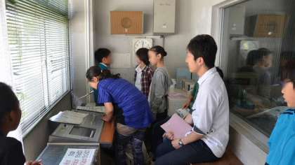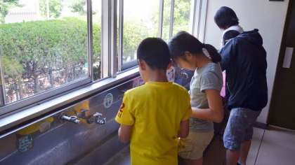 委員会の中には、話し合いの後で実際の活動に取り組んでいるところもありました。上は放送室でアナウンスの練習をする放送委員会。下は流し台の石けんの点検や取り替えをしている保健委員会です。学校の仕事をしっかり受け持っている高学年の委員会活動が、みんなの楽しい学校生活を支えています。