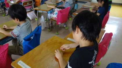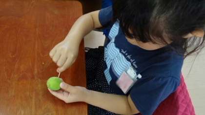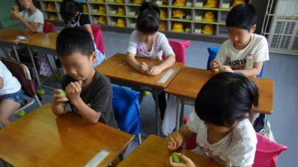 生活科の授業として行った梅ジュースづくり。洗った梅の実のへたを爪楊枝で取り除きます。結構細かい作業でみんな苦労していましたが、この真剣な表情をご覧ください。