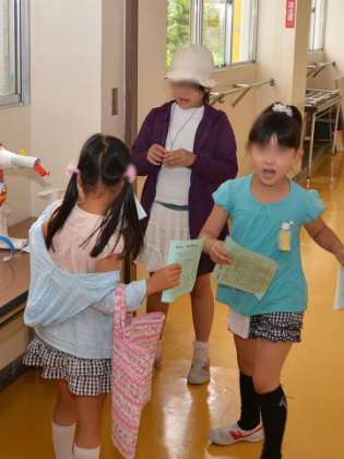 5年生は2階絵本の部屋と体育館にお店を出しました。絵本の部屋では「グルグルバット」と「人探し」のお店をしました。バットを額に押し当てて15回回ったあと、目的の場所までまっすぐ進めるか競うゲームと、校舎内に散らばった5年生の子どもたちを探し出してスタンプをもらうゲームです。