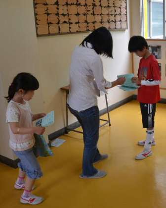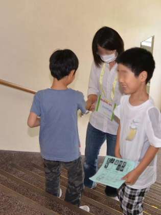 PTA役員さんにも協力していただきました。「PTA役員さんをさがそう!」といって、役員さんが校舎内を歩き回り、子どもたちとじゃんけんをして、子どもたちが勝ったらシールをカードにはってやるというゲームです。勝ってシールをもらい、大喜びの子どもたちです。