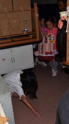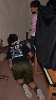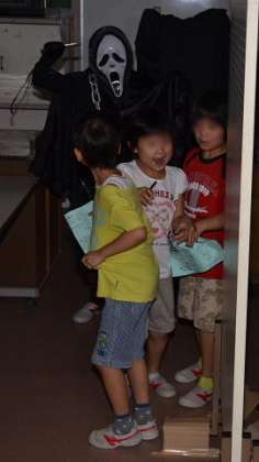 6年生は2クラスともいわゆる「お化け屋敷」です。毎年恒例のお化け屋敷は大人気。また、6年生にとっては、このお化け屋敷をすることが夢です。6年1組は3階家庭科室の窓に段ボールを張りつめ暗くして「闇につつまれた館」をしました。内容はけっこう本格的で、低学年の中には、だいぶ怖がっていた子もいました。そんな時は、担当の子がやさしくサポートしていました。