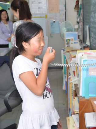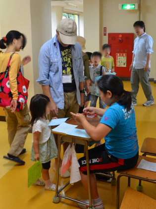 お店番交代の放送をする6年生のほっぺたからあごにかけては、お化け屋敷のメイクがくっきりです。さあ後半のお楽しみです。校舎内は回り歩く子どもたちと地域、保護者・家族の方で賑わっていました。