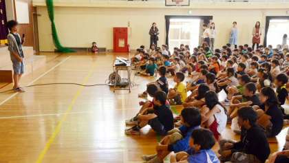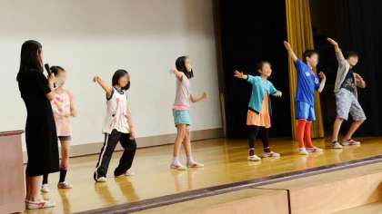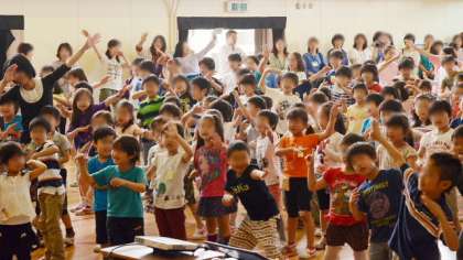 8日(土)「希望っ子まつり」の後、体育館で児童会主催の「40周年記念集会」を、17日(月)の開校記念日に先だってを行いました。会場には、多くの保護者の方々にもおいでいただき開会です。まずみんなでゲームです。まず、児童会運営委員と代表委員がかけ声とポーズの見本を見せます。それにあわせてみんなもポーズ!
