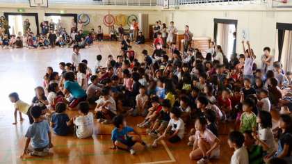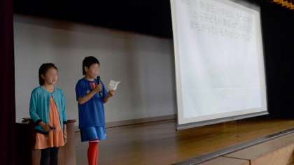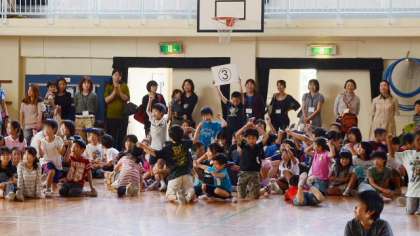 続いて40周年記念クイズです。児童会運営委員が考えた40周年にちなん3択クイズを5問出しました。正解だと思う表示のところに移動します。当たった子は大喜びです。