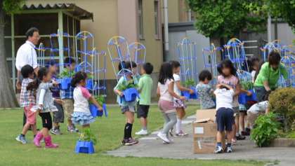 11日(火)、1年生が育てているアサガオの鉢に、支柱を取り付けました。今年は予想以上に成長が早く、もうツルがどんどん伸び始めているので、予定を繰り上げて支柱を取り付けました。つけ終わった後、子どもたちが伸びるのを楽しみにしているようすが、とってもほほえましいですね。
