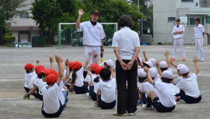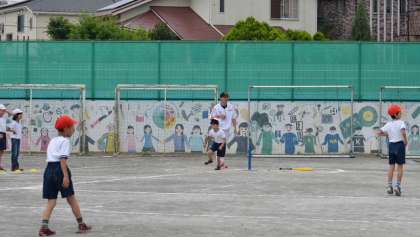 3年生は今日初めてゲームをしました。ルールを教えてもらって、4チームに分かれ、2カ所でゲームを楽しみました。最初はとまどっていたものの、すぐにルールを覚え、攻守を工夫しながら楽しむことができました。