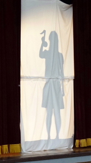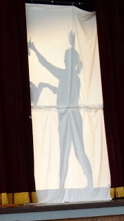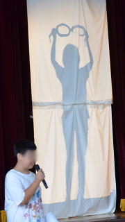 さあこのシルエットはだれでしょうか? 三択クイズにして出題しました。子どもたちみんな大盛り上がり。シルエット役もいろいろ工夫しました。