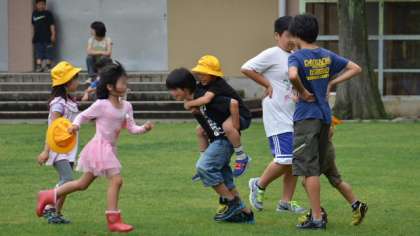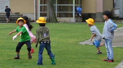 雨あがりの校庭、芝生では12年生が走り回って遊んでいましたが、高学年がいつも遊んでいる土のグランドは、残念ながらまだ遊べませんでした。そんな中、6年生の男子が芝生に出てきて、1年生と一緒に遊んであげていました。これには1年生も大喜びでした。ほほえましい風景です。