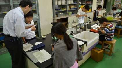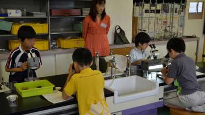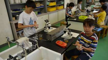 講師は千歳台にお住まいの大学の先生です。今日は身近にある赤土を洗って、中に含まれる鉱物を顕微鏡で見てみる実験をしました。最初に赤土を双眼実態顕微鏡でのぞいただけでも感激の声があがりましたが、ていねいに赤土を洗った後、残った粒をのぞいたときは、さらに驚きの声が上がっていました。次回は7月14日、「エネルギー」について実験します。