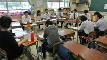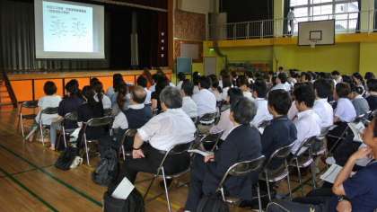 19日(水)午後、船橋希望学舎の「学習習得確認会議」が千歳台小学校で開催されました。学舎を構成する船橋希望中学校と、千歳台小学校、船橋小学校、希望丘小学校4校の教員がすべて集まって、子どもたちの学力向上、学校生活の充実について話し合いました。最初に体育館に集まり、中学校、小学校の学習面における分析、課題や方策について発表を聞き、その後、教科ごとの部会に分かれて熱心な話し合いを行いました。