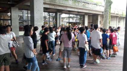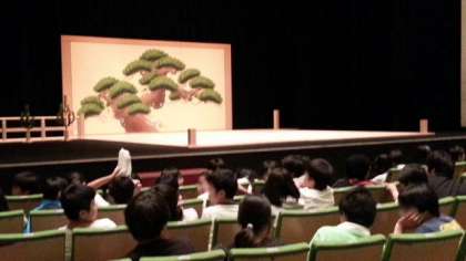20日(木)、6年生が世田谷区民会館に貸し切りバスで出かけ、古典芸能のひとつ狂言を鑑賞してきました。これは毎年世田谷区教育委員会が「万作の会」の皆さんの協力を得て開催しているものです。「万作の会」は、狂言師、野村万作さんを中心に公演を行うグループです。この日は7校の6年生が参加し、前半は代表児童が舞台に上がってワークショップ形式で狂言について学びました。後半は演目「附子(ぶす)」を鑑賞しました。ワークショップでは、本校代表2名も、しっかり演じてみせるなど立派でした。残念ながらそのようすは撮影禁止でお伝えできませんが、子どもたちは、この貴重な体験を有意義にすごすことができました。(写真上は、区民会館の舞台に特設された能舞台)