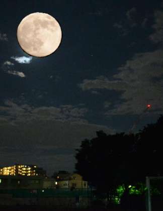 22日の月です。月齢を調べたら13でした。ということは明後日月曜日が満月ですね。とてもきれいに見えたので写真を撮りました。そこで写真にちょっと細工を・・・左の写真は遠景に望遠レンズで撮った右の写真を重ねた合成です。