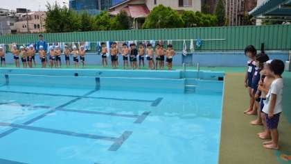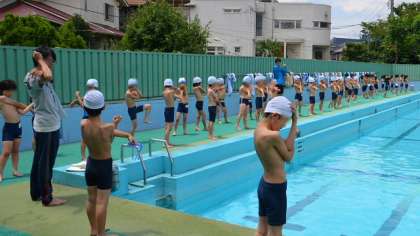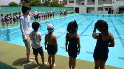 27日(木)3・4校時、1・2年生のプール開きをしました。早朝は気温が低かったものの、8時過ぎくらいから日差しが出てきて気温が上昇してきました。本校では実質的に子どもたちがプールに入るのは最初となります。9時半頃から、学校がお願いしている二人の水泳指導員の方がプールにいらっしゃって、準備をしてくださいました。10時30分、12年の子どもたちがプールに来て更衣室で着替え。さあプール開きです。最初に児童代表のあいさつをしました。12年生それぞれ、自分の目標をしっかり述べることができて立派でした。担任からプール使用の注意をした後、みんなそろって準備運動です。