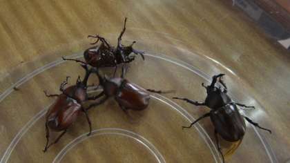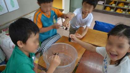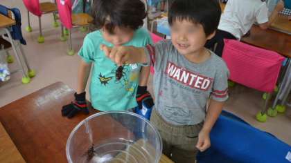 28日2校時、1年1組の生活科のようすです。「夏をさがそう」という課題の授業です。虫の大好きな子もいれば、大嫌いな子もいますが、今日は、希望丘小学校産のカブトムシとふれあおうということで授業をしました。各班4・5匹、一人1匹のカブトムシをグループに配ったところ、写真のように大盛り上がりでした。最初はおっかなびっくりだった子が、授業時間の最後には、カブトムシを手にもってうれしそうにしていたのが印象的です。