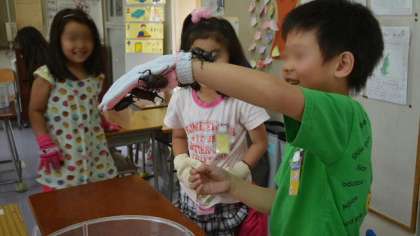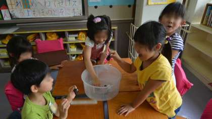 3校時は1年2組も生活科でカブトムシを題材に授業をしました。今日の授業の目的は、夏を感じる自然の事物にふれるということと、生命の尊さを感じさせる事もありました。カブトムシの寿命は1年で、去年の夏にいたカブトムシは8月には全部しんでしまいました。しかし、昨年の夏に受け継がれた命が、こうやって続いていることも、子どもたちに伝えたかったことです。虫が苦手な子の中には、腕にくっついたカブトムシの感触に泣いてしまうという場面もありましたが、水槽の中のカブトムシを見つめる目が、この1時間の授業の中で少し変化したように見えました。