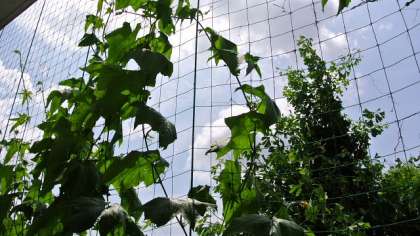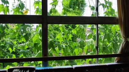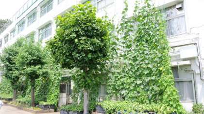 グリーンカーテンがもう2階を覆っています。教室の中から見るとこんな感じです。日差しを遮って室温を少し下げています。先端はすでに3階にとどいています。