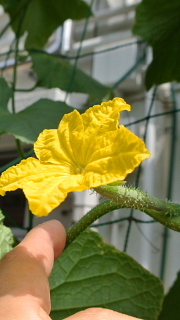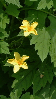 グリーンカーテンは今黄色い花が盛りです。キュウリの大きい花と、小さなゴーヤの花です。