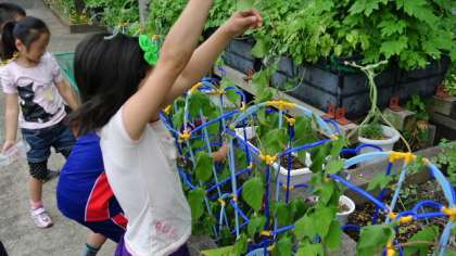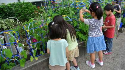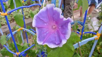 1年生が毎朝水やりをしているアサガオ。しかし今日は土・日と二日間やっていないので、中にはちょっとくたっとしているものも・・・そこで子どもたちは、はりきって水やりしていました。でも丹精の甲斐あって、美しい花が毎日のように咲いています。