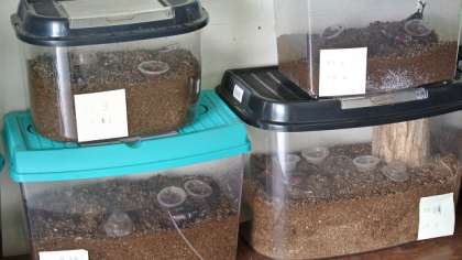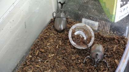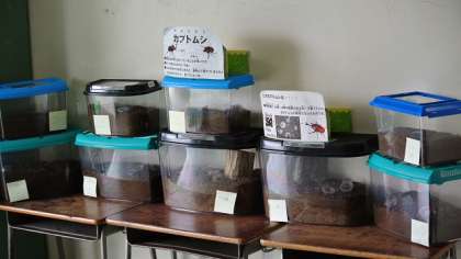 玄関のカブトムシコーナーに、こんなにケースが並んでしまいました。それぞれにオス・メスが合わせて5〜8匹ずつ入っています。東昇降口で育てた幼虫はすべて成虫になって、ここにいます。昼はわりとおとなしいのですが、夜はえさをめぐって活発に動いています。来校の際にのぞいてみてください。