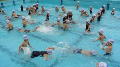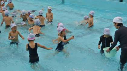 さすが2年生です。しっかり浮いています。後半は遊びの要素を取り入れて、水中に沈めたゴムボールを拾い集める活動を行いました。最初はおそるおそるプールの底にあるボールに手を伸ばしていた子も、何度もやるうちに慣れてきて、はしゃいでやっていました。夏休みまでに動き方やルールを習得して、夏休みのプールにはたくさん出てきてほしいと思います。