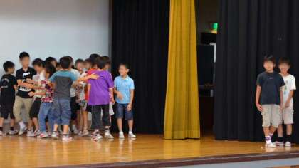 5日(金)朝、体育館で行った児童集会は、4年生の発表です。40周年にちなんで、40年前の希望丘小学校から子どもたちがタイムスリップしてきたという想定の寸劇を行い、後半は川崎洋さんの詩「祝辞」を群読しました。元気な4年生、寸劇も表情よく演じ、群読では各地の方言を盛り込んだ「おめでと おめでとがんす おめでとがす おめでとござりすた・・・・・」とはきはきと暗唱できました。