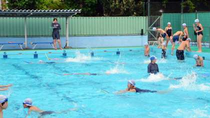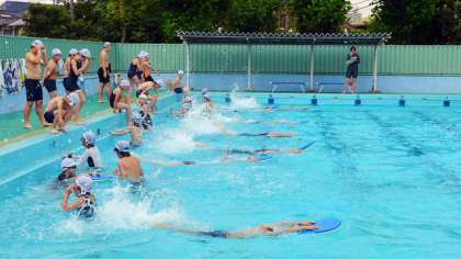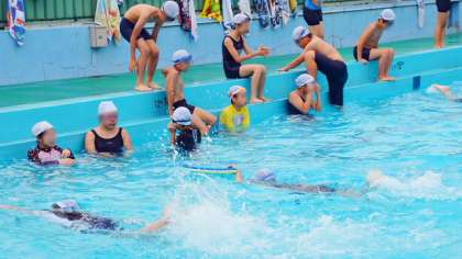 水泳指導の後半は、5・6年生が継続して取り組んでいるグループごとのリレーです。リレーで何往復できるかを、各グループが目標をもって取り組んでいます。限られた時間の中で、活動量を増やす工夫です。子どもたちも真剣に取り組んでいました。