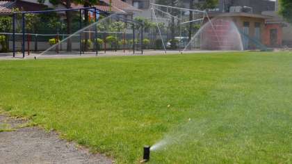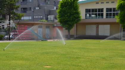 8日は朝から記音がうなぎ登りで、昼休みの遊びを前に芝生に散水しましたが、この猛暑にはかないません。少しはすずしくなったかな?