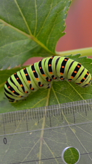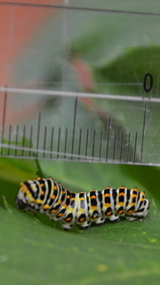 近隣の方からキアゲハの幼虫を2匹いただきました。1匹は5センチほどに成長したご4齢か5齢、もう1匹は最初の脱皮を終えたばかりの2齢の幼虫です。普通のアゲハとは全くちがう鮮やかな縞模様が特長です。校内に生えているアシタバを与えて育てています。