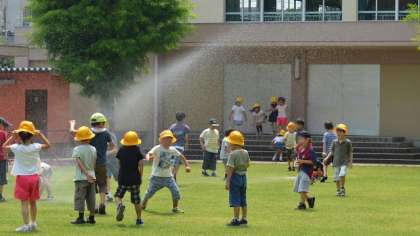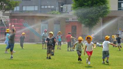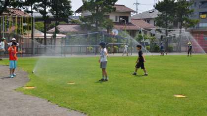 9日昼休み、元気に校庭で遊んでいる子どもたちに、ちょっとだけサービス。芝生の散水をしました。強い日差しの中で、ミスト状の水しぶきを浴びて、少し涼しくなったようです。中にはちょっと水に濡れすぎた子もいたようですが、この高温ですぐに乾いてしまいました。