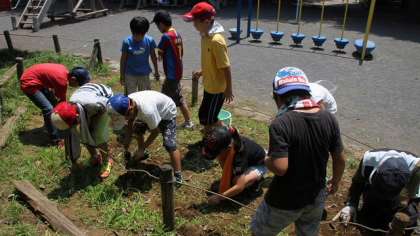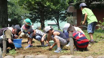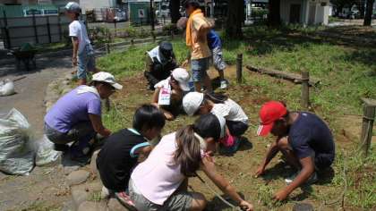 本校では、近隣の葭根公園に本校が植栽する花壇を借りています。世話をするのは3年生です。今日は3年生が出かけて、花を植えました。猛暑の中でしたので、手早く作業をして戻ってくる予定でしたが、雑草が多く、草取りに予定より時間がかかってしまいました。それでも子どもたちは黙々と作業をしました。