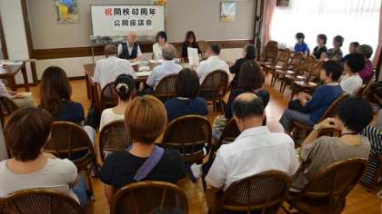 13日土曜授業日、9時から10時まで、40周年記念公開座談会をランチルームで行いました。今年度本校は、開校から40周年をむかえ、数々の記念事業を行っておりますが、今回もその一つです。学区域が開発される以前のようす、希望ヶ丘団地書記の頃から希望丘小学校開校に至るようす。そして児童数の多かった10周年の頃から、現在に至る変遷を、お集まりいただいた地域、保護者の皆さんに語っていただきました。