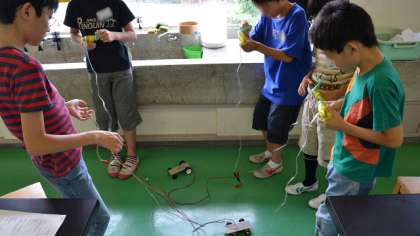 14日(日)午前、本校理科室で、青少年船橋地区委員会が主催している、「子どもぶんか村」の「まち探検くらぶ」、今年度第2回目の活動を行いました。今日のテーマは「エネルギーを体験しよう」です。前半は電気についての実験です。手回し発電機を使って豆電球やLED、モーターを回してみます。豆電球を明るく灯すのはけっこう大変です。エネルギーの大切さを実感したでしょうか。手回し発電機を、モーターのついたリモコンカーにつないで、前後左右に協力しながら走らせました。息があうまで時間がかかりましたが、最後は声をかけ合ってコントロールできるようになりました。