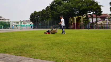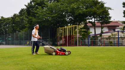 この校庭の芝のおかげで、この時期砂漠のようなグランドに比べて芝生の上は暑さが少し緩和されているように感じます。また、校舎側が芝生なので、グリーンカーテンと併せてさわやかな感じがします。今日は、エンジン芝刈機で芝刈りをしました。終わったところでちょうど良く夕立となり、緑が心なしか生き生きとしたように感じました。