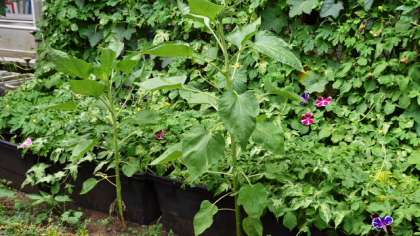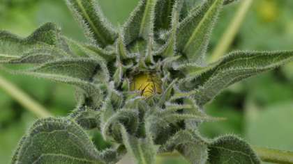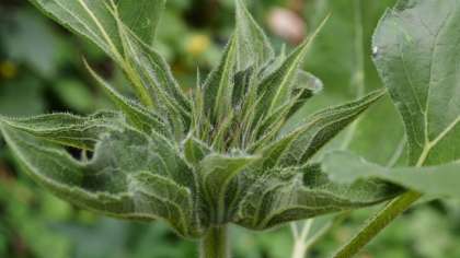 グリーンカーテンのプランターの前に植えているヒマワリが、もうすぐ咲きそうです。花芽を上からみるとこんな様子です。