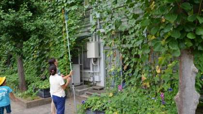 グリーンカーテンには今次々とキュウリがなっています。だいぶ高いところになるようになったので、主事が高枝切りばさみをもってきて収獲しました。