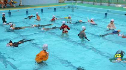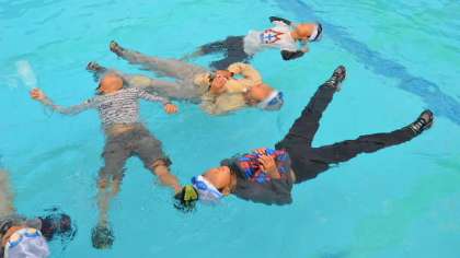 続いてペットボトルをもって、浮いてみる体験をします。初めて経験する3年生の中には、浮きの役割をするペットボトルをもっていても、なかなか体をリラックスさせて浮くことができない子もいます。それに比べると2回目の経験となる4年生はずいぶん余裕があります。何事も経験が大切ですね。